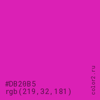 Цвет #DB20B5 в цветовой модели RGB обозначается тремя октетами (219, 32, 181) в десятичном формате и #DB20B5 в шестнадцатиричном (hex) формате, которые являются интенсивностью красного 219 (hex DB), интенсивность зелёного 32 (hex 20) и интенсивность синего 181 (hex B5).