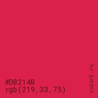Цвет #DB214B в цветовой модели RGB обозначается тремя октетами (219, 33, 75) в десятичном формате и #DB214B в шестнадцатиричном (hex) формате, которые являются интенсивностью красного 219 (hex DB), интенсивность зелёного 33 (hex 21) и интенсивность синего 75 (hex 4B).