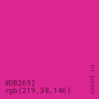 Цвет #DB2692 в цветовой модели RGB обозначается тремя октетами (219, 38, 146) в десятичном формате и #DB2692 в шестнадцатиричном (hex) формате, которые являются интенсивностью красного 219 (hex DB), интенсивность зелёного 38 (hex 26) и интенсивность синего 146 (hex 92).
