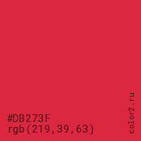 Цвет #DB273F в цветовой модели RGB обозначается тремя октетами (219, 39, 63) в десятичном формате и #DB273F в шестнадцатиричном (hex) формате, которые являются интенсивностью красного 219 (hex DB), интенсивность зелёного 39 (hex 27) и интенсивность синего 63 (hex 3F).