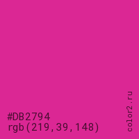 Цвет #DB2794 в цветовой модели RGB обозначается тремя октетами (219, 39, 148) в десятичном формате и #DB2794 в шестнадцатиричном (hex) формате, которые являются интенсивностью красного 219 (hex DB), интенсивность зелёного 39 (hex 27) и интенсивность синего 148 (hex 94).