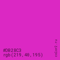 Цвет #DB28C3 в цветовой модели RGB обозначается тремя октетами (219, 40, 195) в десятичном формате и #DB28C3 в шестнадцатиричном (hex) формате, которые являются интенсивностью красного 219 (hex DB), интенсивность зелёного 40 (hex 28) и интенсивность синего 195 (hex C3).