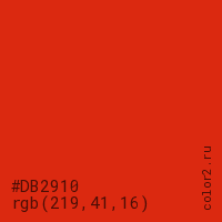 Цвет #DB2910 в цветовой модели RGB обозначается тремя октетами (219, 41, 16) в десятичном формате и #DB2910 в шестнадцатиричном (hex) формате, которые являются интенсивностью красного 219 (hex DB), интенсивность зелёного 41 (hex 29) и интенсивность синего 16 (hex 10).