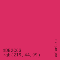 Цвет #DB2C63 в цветовой модели RGB обозначается тремя октетами (219, 44, 99) в десятичном формате и #DB2C63 в шестнадцатиричном (hex) формате, которые являются интенсивностью красного 219 (hex DB), интенсивность зелёного 44 (hex 2C) и интенсивность синего 99 (hex 63).