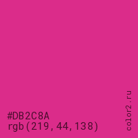 Цвет #DB2C8A в цветовой модели RGB обозначается тремя октетами (219, 44, 138) в десятичном формате и #DB2C8A в шестнадцатиричном (hex) формате, которые являются интенсивностью красного 219 (hex DB), интенсивность зелёного 44 (hex 2C) и интенсивность синего 138 (hex 8A).
