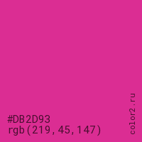Цвет #DB2D93 в цветовой модели RGB обозначается тремя октетами (219, 45, 147) в десятичном формате и #DB2D93 в шестнадцатиричном (hex) формате, которые являются интенсивностью красного 219 (hex DB), интенсивность зелёного 45 (hex 2D) и интенсивность синего 147 (hex 93).