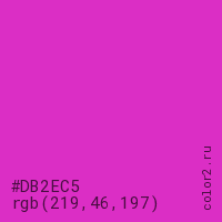 Цвет #DB2EC5 в цветовой модели RGB обозначается тремя октетами (219, 46, 197) в десятичном формате и #DB2EC5 в шестнадцатиричном (hex) формате, которые являются интенсивностью красного 219 (hex DB), интенсивность зелёного 46 (hex 2E) и интенсивность синего 197 (hex C5).