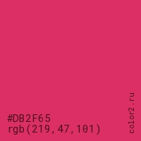 Цвет #DB2F65 в цветовой модели RGB обозначается тремя октетами (219, 47, 101) в десятичном формате и #DB2F65 в шестнадцатиричном (hex) формате, которые являются интенсивностью красного 219 (hex DB), интенсивность зелёного 47 (hex 2F) и интенсивность синего 101 (hex 65).