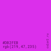 Цвет #DB2FEB в цветовой модели RGB обозначается тремя октетами (219, 47, 235) в десятичном формате и #DB2FEB в шестнадцатиричном (hex) формате, которые являются интенсивностью красного 219 (hex DB), интенсивность зелёного 47 (hex 2F) и интенсивность синего 235 (hex EB).