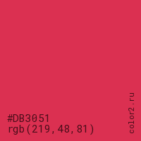Цвет #DB3051 в цветовой модели RGB обозначается тремя октетами (219, 48, 81) в десятичном формате и #DB3051 в шестнадцатиричном (hex) формате, которые являются интенсивностью красного 219 (hex DB), интенсивность зелёного 48 (hex 30) и интенсивность синего 81 (hex 51).