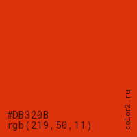 Цвет #DB320B в цветовой модели RGB обозначается тремя октетами (219, 50, 11) в десятичном формате и #DB320B в шестнадцатиричном (hex) формате, которые являются интенсивностью красного 219 (hex DB), интенсивность зелёного 50 (hex 32) и интенсивность синего 11 (hex 0B).
