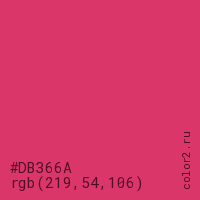Цвет #DB366A в цветовой модели RGB обозначается тремя октетами (219, 54, 106) в десятичном формате и #DB366A в шестнадцатиричном (hex) формате, которые являются интенсивностью красного 219 (hex DB), интенсивность зелёного 54 (hex 36) и интенсивность синего 106 (hex 6A).