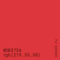 Цвет #DB373A в цветовой модели RGB обозначается тремя октетами (219, 55, 58) в десятичном формате и #DB373A в шестнадцатиричном (hex) формате, которые являются интенсивностью красного 219 (hex DB), интенсивность зелёного 55 (hex 37) и интенсивность синего 58 (hex 3A).