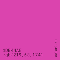 Цвет #DB44AE в цветовой модели RGB обозначается тремя октетами (219, 68, 174) в десятичном формате и #DB44AE в шестнадцатиричном (hex) формате, которые являются интенсивностью красного 219 (hex DB), интенсивность зелёного 68 (hex 44) и интенсивность синего 174 (hex AE).