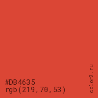 Цвет #DB4635 в цветовой модели RGB обозначается тремя октетами (219, 70, 53) в десятичном формате и #DB4635 в шестнадцатиричном (hex) формате, которые являются интенсивностью красного 219 (hex DB), интенсивность зелёного 70 (hex 46) и интенсивность синего 53 (hex 35).