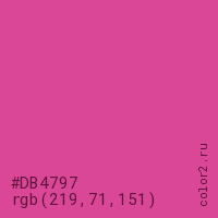 Цвет #DB4797 в цветовой модели RGB обозначается тремя октетами (219, 71, 151) в десятичном формате и #DB4797 в шестнадцатиричном (hex) формате, которые являются интенсивностью красного 219 (hex DB), интенсивность зелёного 71 (hex 47) и интенсивность синего 151 (hex 97).