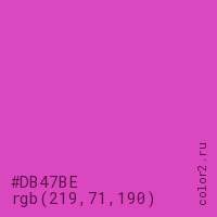 Цвет #DB47BE в цветовой модели RGB обозначается тремя октетами (219, 71, 190) в десятичном формате и #DB47BE в шестнадцатиричном (hex) формате, которые являются интенсивностью красного 219 (hex DB), интенсивность зелёного 71 (hex 47) и интенсивность синего 190 (hex BE).