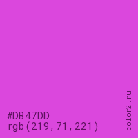 Цвет #DB47DD в цветовой модели RGB обозначается тремя октетами (219, 71, 221) в десятичном формате и #DB47DD в шестнадцатиричном (hex) формате, которые являются интенсивностью красного 219 (hex DB), интенсивность зелёного 71 (hex 47) и интенсивность синего 221 (hex DD).