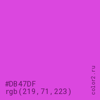 Цвет #DB47DF в цветовой модели RGB обозначается тремя октетами (219, 71, 223) в десятичном формате и #DB47DF в шестнадцатиричном (hex) формате, которые являются интенсивностью красного 219 (hex DB), интенсивность зелёного 71 (hex 47) и интенсивность синего 223 (hex DF).