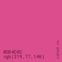 Цвет #DB4D8C в цветовой модели RGB обозначается тремя октетами (219, 77, 140) в десятичном формате и #DB4D8C в шестнадцатиричном (hex) формате, которые являются интенсивностью красного 219 (hex DB), интенсивность зелёного 77 (hex 4D) и интенсивность синего 140 (hex 8C).