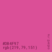 Цвет #DB4F97 в цветовой модели RGB обозначается тремя октетами (219, 79, 151) в десятичном формате и #DB4F97 в шестнадцатиричном (hex) формате, которые являются интенсивностью красного 219 (hex DB), интенсивность зелёного 79 (hex 4F) и интенсивность синего 151 (hex 97).