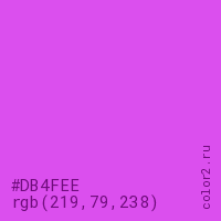 Цвет #DB4FEE в цветовой модели RGB обозначается тремя октетами (219, 79, 238) в десятичном формате и #DB4FEE в шестнадцатиричном (hex) формате, которые являются интенсивностью красного 219 (hex DB), интенсивность зелёного 79 (hex 4F) и интенсивность синего 238 (hex EE).