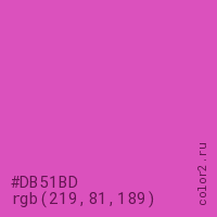 Цвет #DB51BD в цветовой модели RGB обозначается тремя октетами (219, 81, 189) в десятичном формате и #DB51BD в шестнадцатиричном (hex) формате, которые являются интенсивностью красного 219 (hex DB), интенсивность зелёного 81 (hex 51) и интенсивность синего 189 (hex BD).