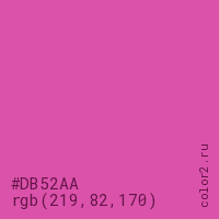 Цвет #DB52AA в цветовой модели RGB обозначается тремя октетами (219, 82, 170) в десятичном формате и #DB52AA в шестнадцатиричном (hex) формате, которые являются интенсивностью красного 219 (hex DB), интенсивность зелёного 82 (hex 52) и интенсивность синего 170 (hex AA).
