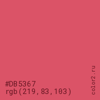Цвет #DB5367 в цветовой модели RGB обозначается тремя октетами (219, 83, 103) в десятичном формате и #DB5367 в шестнадцатиричном (hex) формате, которые являются интенсивностью красного 219 (hex DB), интенсивность зелёного 83 (hex 53) и интенсивность синего 103 (hex 67).