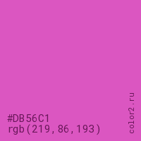 Цвет #DB56C1 в цветовой модели RGB обозначается тремя октетами (219, 86, 193) в десятичном формате и #DB56C1 в шестнадцатиричном (hex) формате, которые являются интенсивностью красного 219 (hex DB), интенсивность зелёного 86 (hex 56) и интенсивность синего 193 (hex C1).