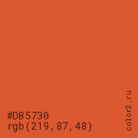 Цвет #DB5730 в цветовой модели RGB обозначается тремя октетами (219, 87, 48) в десятичном формате и #DB5730 в шестнадцатиричном (hex) формате, которые являются интенсивностью красного 219 (hex DB), интенсивность зелёного 87 (hex 57) и интенсивность синего 48 (hex 30).