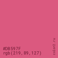 Цвет #DB597F в цветовой модели RGB обозначается тремя октетами (219, 89, 127) в десятичном формате и #DB597F в шестнадцатиричном (hex) формате, которые являются интенсивностью красного 219 (hex DB), интенсивность зелёного 89 (hex 59) и интенсивность синего 127 (hex 7F).