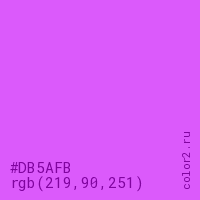 Цвет #DB5AFB в цветовой модели RGB обозначается тремя октетами (219, 90, 251) в десятичном формате и #DB5AFB в шестнадцатиричном (hex) формате, которые являются интенсивностью красного 219 (hex DB), интенсивность зелёного 90 (hex 5A) и интенсивность синего 251 (hex FB).