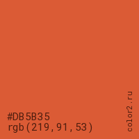 Цвет #DB5B35 в цветовой модели RGB обозначается тремя октетами (219, 91, 53) в десятичном формате и #DB5B35 в шестнадцатиричном (hex) формате, которые являются интенсивностью красного 219 (hex DB), интенсивность зелёного 91 (hex 5B) и интенсивность синего 53 (hex 35).