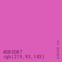 Цвет #DB5DB7 в цветовой модели RGB обозначается тремя октетами (219, 93, 183) в десятичном формате и #DB5DB7 в шестнадцатиричном (hex) формате, которые являются интенсивностью красного 219 (hex DB), интенсивность зелёного 93 (hex 5D) и интенсивность синего 183 (hex B7).