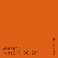 Цвет #DB6014 в цветовой модели RGB обозначается тремя октетами (219, 96, 20) в десятичном формате и #DB6014 в шестнадцатиричном (hex) формате, которые являются интенсивностью красного 219 (hex DB), интенсивность зелёного 96 (hex 60) и интенсивность синего 20 (hex 14).