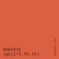 Цвет #DB6042 в цветовой модели RGB обозначается тремя октетами (219, 96, 66) в десятичном формате и #DB6042 в шестнадцатиричном (hex) формате, которые являются интенсивностью красного 219 (hex DB), интенсивность зелёного 96 (hex 60) и интенсивность синего 66 (hex 42).