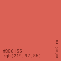 Цвет #DB6155 в цветовой модели RGB обозначается тремя октетами (219, 97, 85) в десятичном формате и #DB6155 в шестнадцатиричном (hex) формате, которые являются интенсивностью красного 219 (hex DB), интенсивность зелёного 97 (hex 61) и интенсивность синего 85 (hex 55).