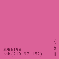 Цвет #DB6198 в цветовой модели RGB обозначается тремя октетами (219, 97, 152) в десятичном формате и #DB6198 в шестнадцатиричном (hex) формате, которые являются интенсивностью красного 219 (hex DB), интенсивность зелёного 97 (hex 61) и интенсивность синего 152 (hex 98).