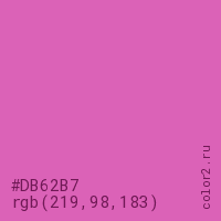 Цвет #DB62B7 в цветовой модели RGB обозначается тремя октетами (219, 98, 183) в десятичном формате и #DB62B7 в шестнадцатиричном (hex) формате, которые являются интенсивностью красного 219 (hex DB), интенсивность зелёного 98 (hex 62) и интенсивность синего 183 (hex B7).