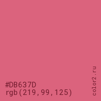 Цвет #DB637D в цветовой модели RGB обозначается тремя октетами (219, 99, 125) в десятичном формате и #DB637D в шестнадцатиричном (hex) формате, которые являются интенсивностью красного 219 (hex DB), интенсивность зелёного 99 (hex 63) и интенсивность синего 125 (hex 7D).