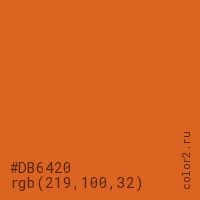 Цвет #DB6420 в цветовой модели RGB обозначается тремя октетами (219, 100, 32) в десятичном формате и #DB6420 в шестнадцатиричном (hex) формате, которые являются интенсивностью красного 219 (hex DB), интенсивность зелёного 100 (hex 64) и интенсивность синего 32 (hex 20).