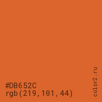 Цвет #DB652C в цветовой модели RGB обозначается тремя октетами (219, 101, 44) в десятичном формате и #DB652C в шестнадцатиричном (hex) формате, которые являются интенсивностью красного 219 (hex DB), интенсивность зелёного 101 (hex 65) и интенсивность синего 44 (hex 2C).