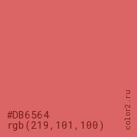 Цвет #DB6564 в цветовой модели RGB обозначается тремя октетами (219, 101, 100) в десятичном формате и #DB6564 в шестнадцатиричном (hex) формате, которые являются интенсивностью красного 219 (hex DB), интенсивность зелёного 101 (hex 65) и интенсивность синего 100 (hex 64).