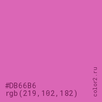 Цвет #DB66B6 в цветовой модели RGB обозначается тремя октетами (219, 102, 182) в десятичном формате и #DB66B6 в шестнадцатиричном (hex) формате, которые являются интенсивностью красного 219 (hex DB), интенсивность зелёного 102 (hex 66) и интенсивность синего 182 (hex B6).