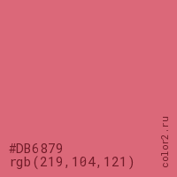 Цвет #DB6879 в цветовой модели RGB обозначается тремя октетами (219, 104, 121) в десятичном формате и #DB6879 в шестнадцатиричном (hex) формате, которые являются интенсивностью красного 219 (hex DB), интенсивность зелёного 104 (hex 68) и интенсивность синего 121 (hex 79).