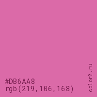 Цвет #DB6AA8 в цветовой модели RGB обозначается тремя октетами (219, 106, 168) в десятичном формате и #DB6AA8 в шестнадцатиричном (hex) формате, которые являются интенсивностью красного 219 (hex DB), интенсивность зелёного 106 (hex 6A) и интенсивность синего 168 (hex A8).