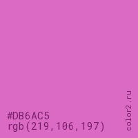 Цвет #DB6AC5 в цветовой модели RGB обозначается тремя октетами (219, 106, 197) в десятичном формате и #DB6AC5 в шестнадцатиричном (hex) формате, которые являются интенсивностью красного 219 (hex DB), интенсивность зелёного 106 (hex 6A) и интенсивность синего 197 (hex C5).