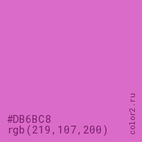 Цвет #DB6BC8 в цветовой модели RGB обозначается тремя октетами (219, 107, 200) в десятичном формате и #DB6BC8 в шестнадцатиричном (hex) формате, которые являются интенсивностью красного 219 (hex DB), интенсивность зелёного 107 (hex 6B) и интенсивность синего 200 (hex C8).
