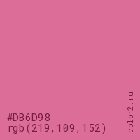 Цвет #DB6D98 в цветовой модели RGB обозначается тремя октетами (219, 109, 152) в десятичном формате и #DB6D98 в шестнадцатиричном (hex) формате, которые являются интенсивностью красного 219 (hex DB), интенсивность зелёного 109 (hex 6D) и интенсивность синего 152 (hex 98).
